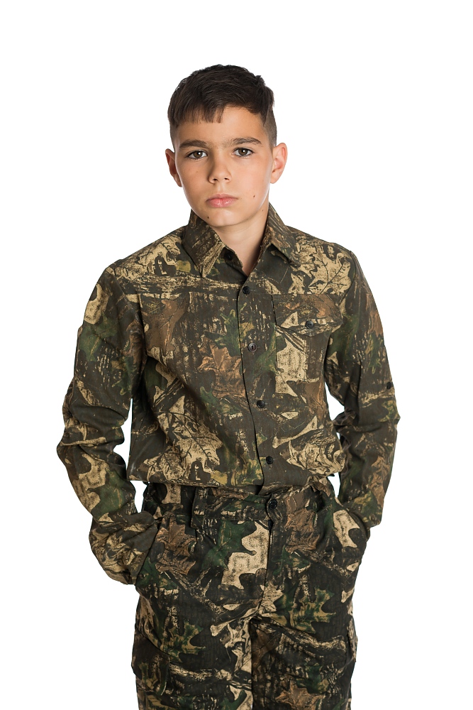 Детска ловна риза с навиващи се ръкави модел ЛЕДА, изработен от плат 50 /50 П/ПЕ камуфлаж, подходяща за лов от пролетта до есента. Дизайна предлага удобство по време на лов, като следва естественото движение на тялото .